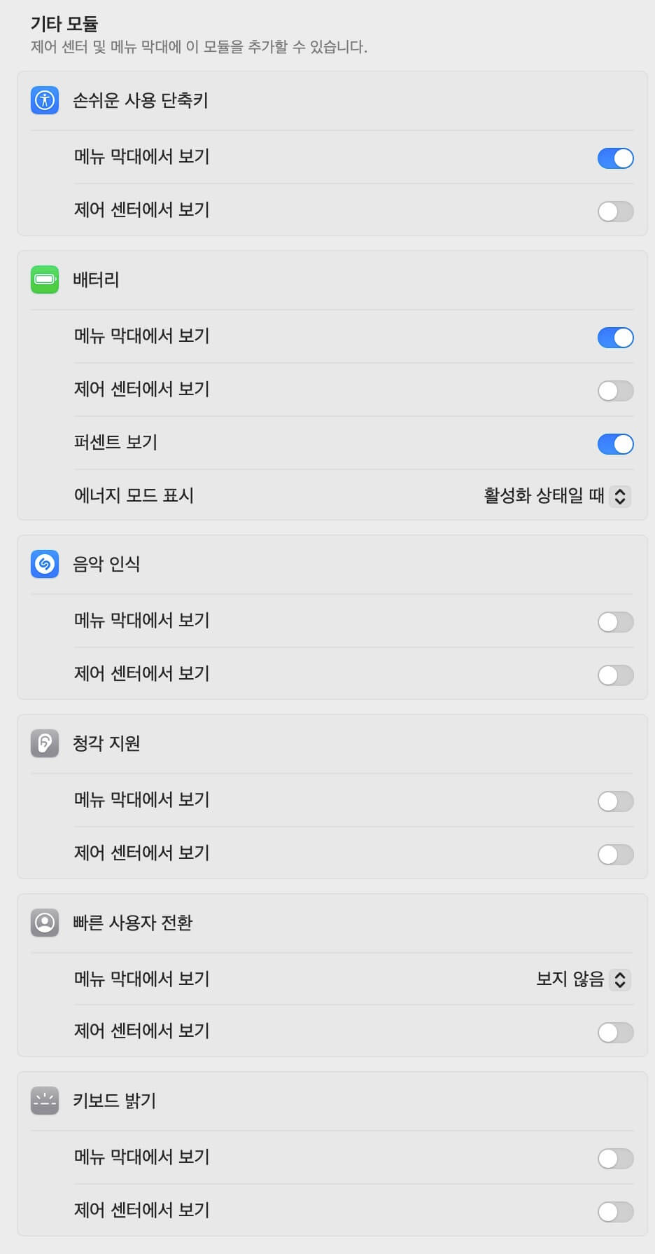 오른쪽 목록에서 메뉴 막대에 추가하고 싶은 기능(예: Wi-Fi, Bluetooth 등)을 선택합니다. - 메뉴 막대에 표시 활성화