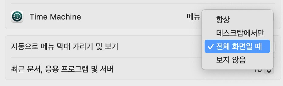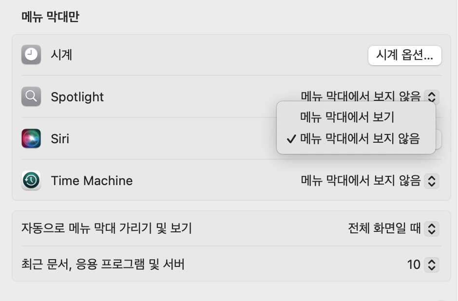 ‘메뉴 막대에 표시’ 옵션을 비활성화하거나, '메뉴 막대에서 보지않음'을 선택해주면 됩니다.