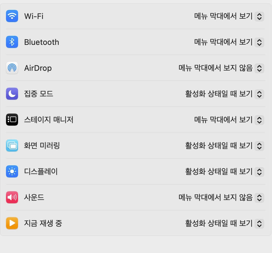 macOS에서는 Wi-Fi, Bluetooth, 사운드 등 기본 시스템 기능을 메뉴 막대에 추가하여 빠르게 접근할 수 있습니다.