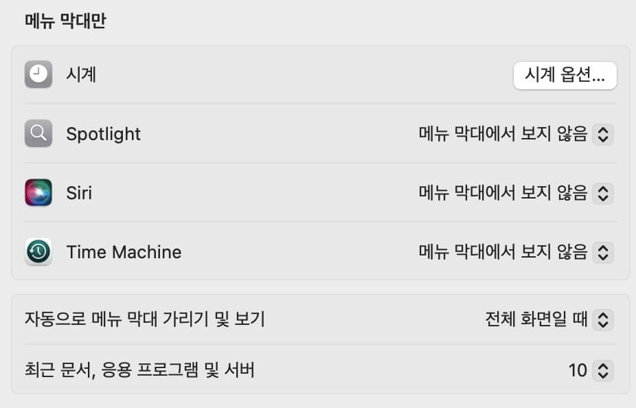 메뉴 막대에서 불필요한 시스템 아이콘을 제거하여 깔끔하게 정리할 수 있습니다.