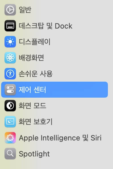 시스템 설정 창에서 왼쪽 사이드바에 있는 ‘제어 센터’를 클릭합니다. - 추가할 항목 선택
