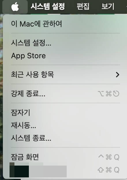 화면 왼쪽 상단의 애플 로고를 클릭한 후, ‘시스템 설정’을 선택합니다.