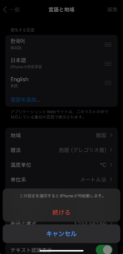 '이 설정을 적용하면 iPhone이 재시동 됩니다'라고 나옵니다. - '계속'을 선택해주세요.