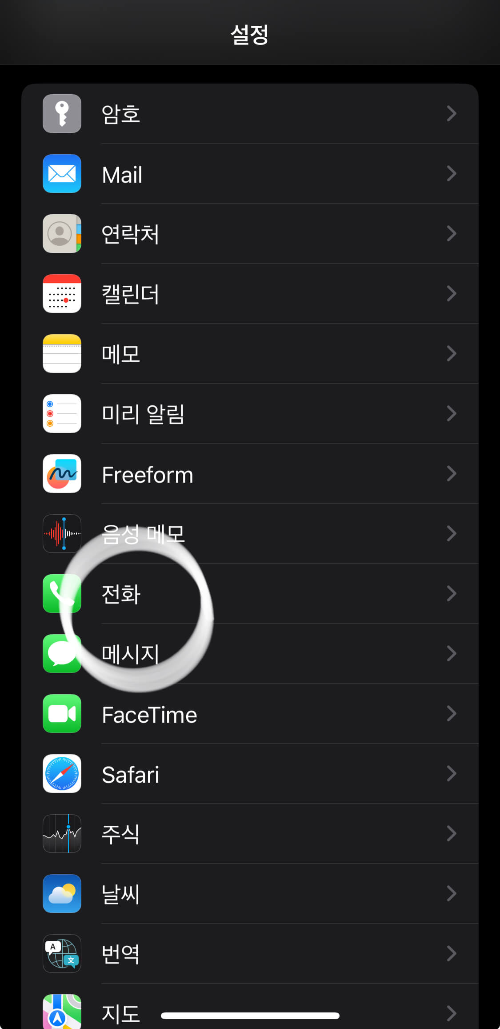 설정화면 스크롤을 내리다 보면 초록색 "전화" 앱이 확인됩니다.