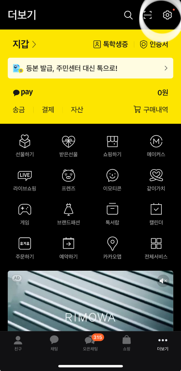 '더 보기'화면에서 우측 상단 톱니바퀴모양(설정)을 선택합니다.