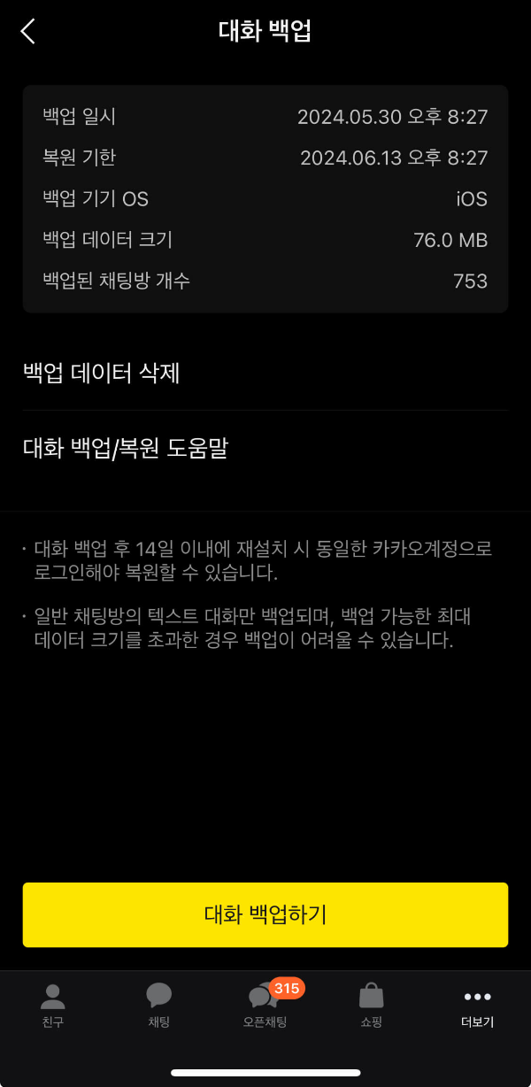 - 일반 채팅방 텍스트 대화만 백업됩니다.