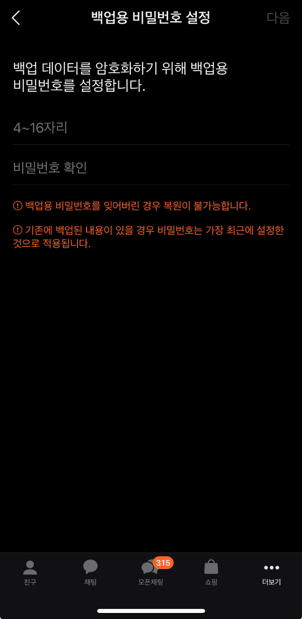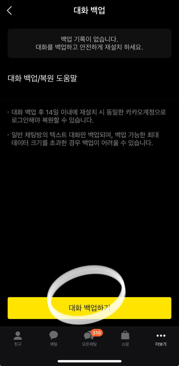 - 일반 채팅방 텍스트 대화만 백업됩니다.