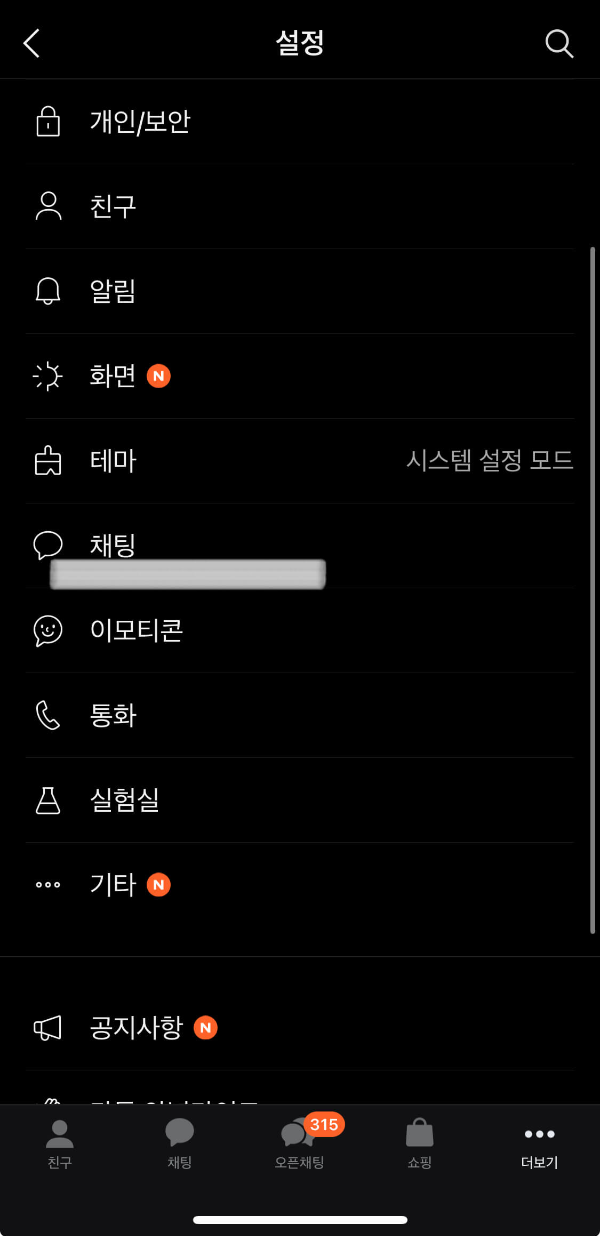 설정 화면에서 화면을 아래로 내리면 '채팅'이 확인됩니다.