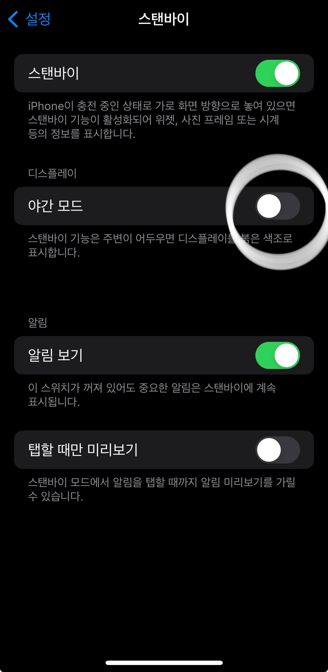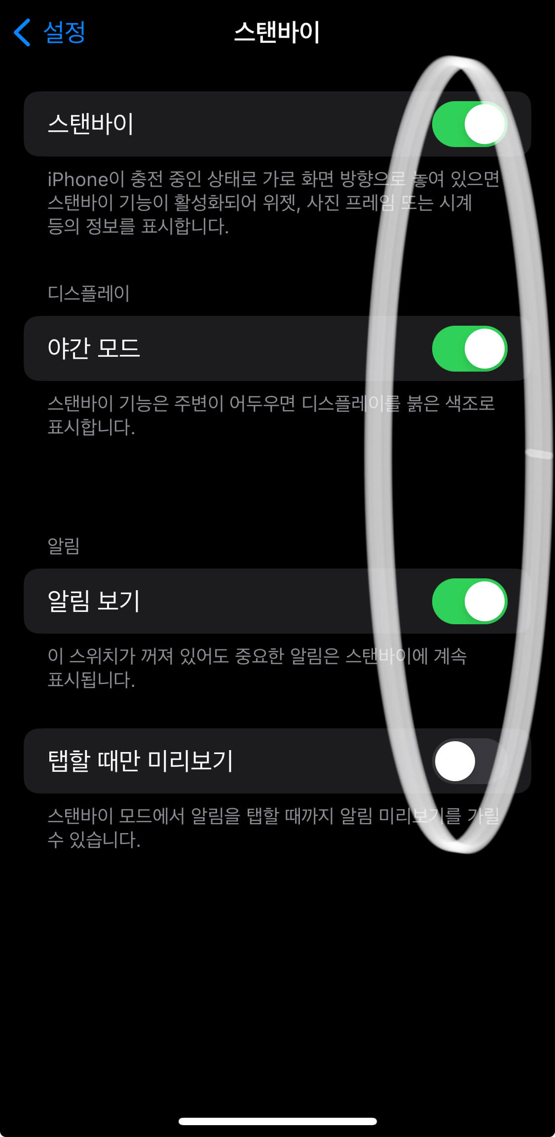 스탠바이 / 야간모드 / 알림보기 / 택할 때만 미리 보기 - 여기서 기본적으로 체크를 3개 해주세요.