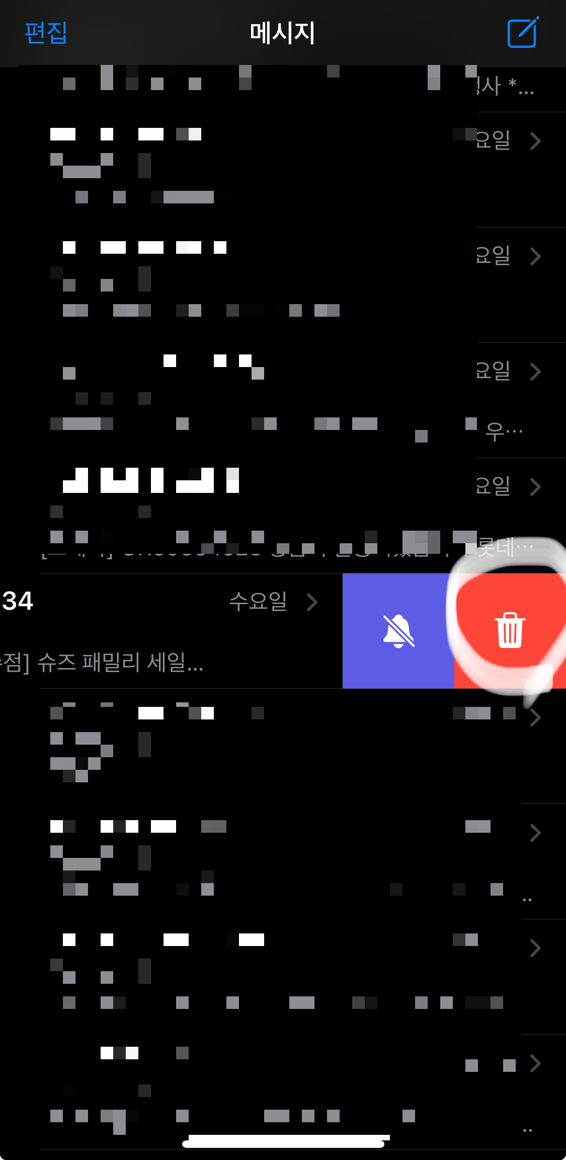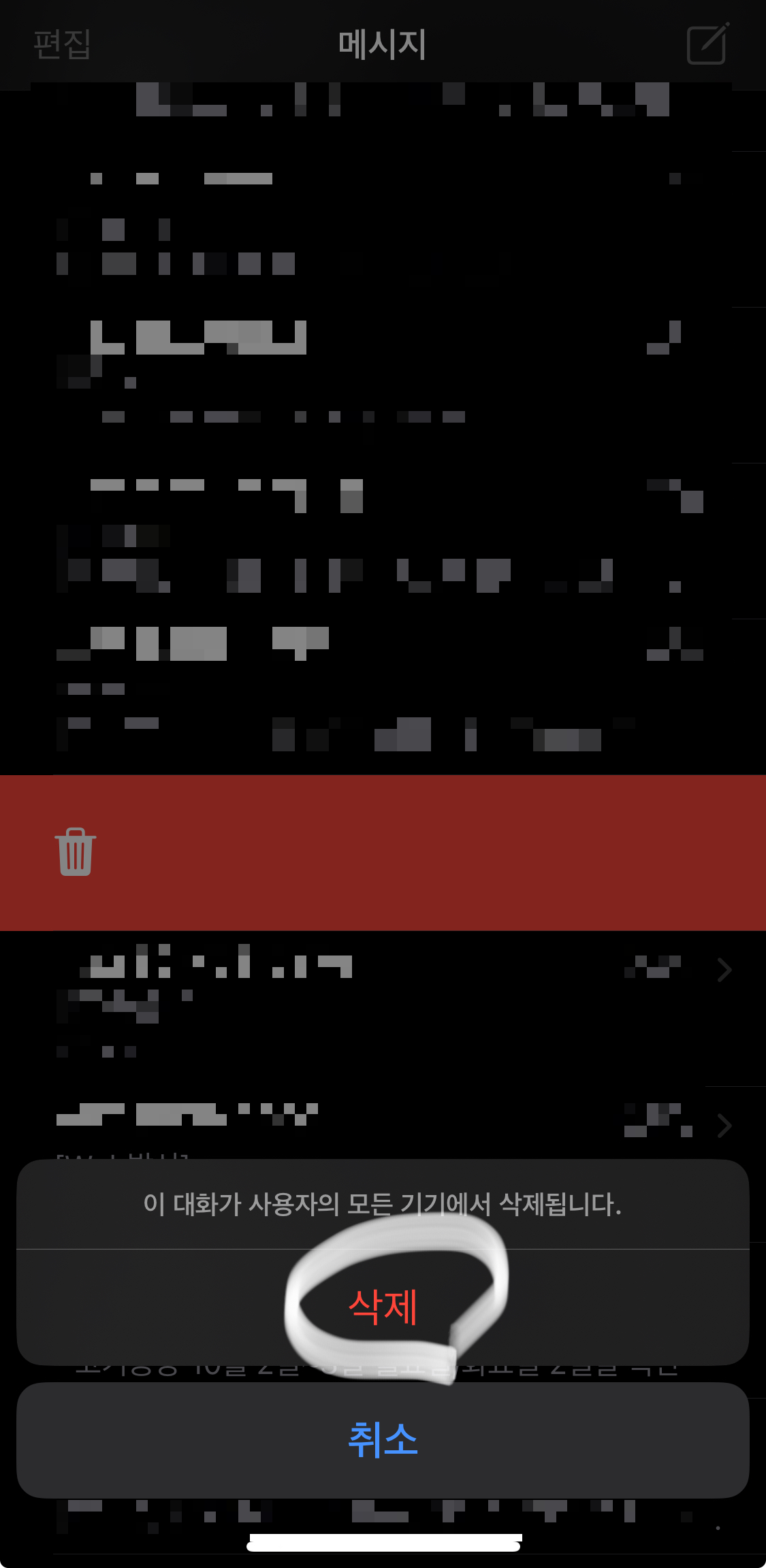 저같은 경우는 해당 차단 메세지를 우측에서 좌측 (오른쪽에서 왼쪽으로 스와이프 한 후)