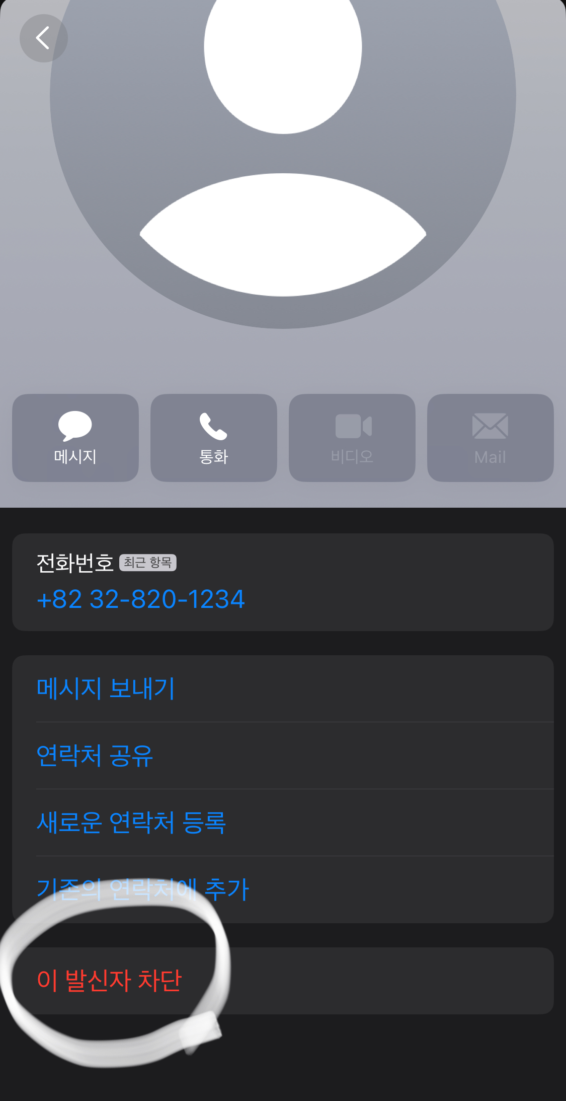 화면 아래쪽에 숨어있는 '이 발신자 차단'은 화면을 살짝 올려주셔야 확인이 가능합니다.