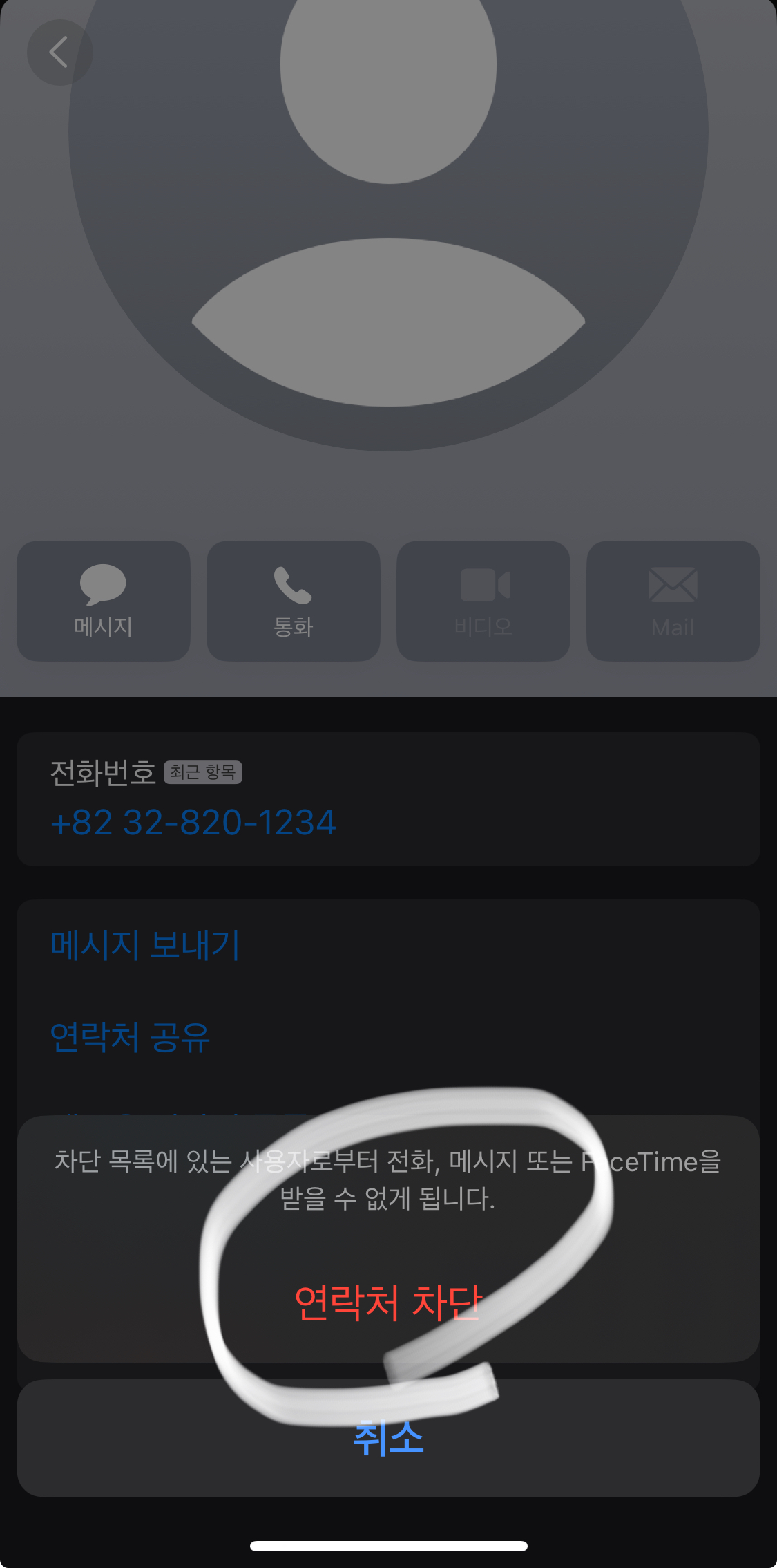 차단 목록에 있는 사용자로부터 전화, 메시지 그리고 페이스타임까지 연락을 받을 수 없게 됩니다.