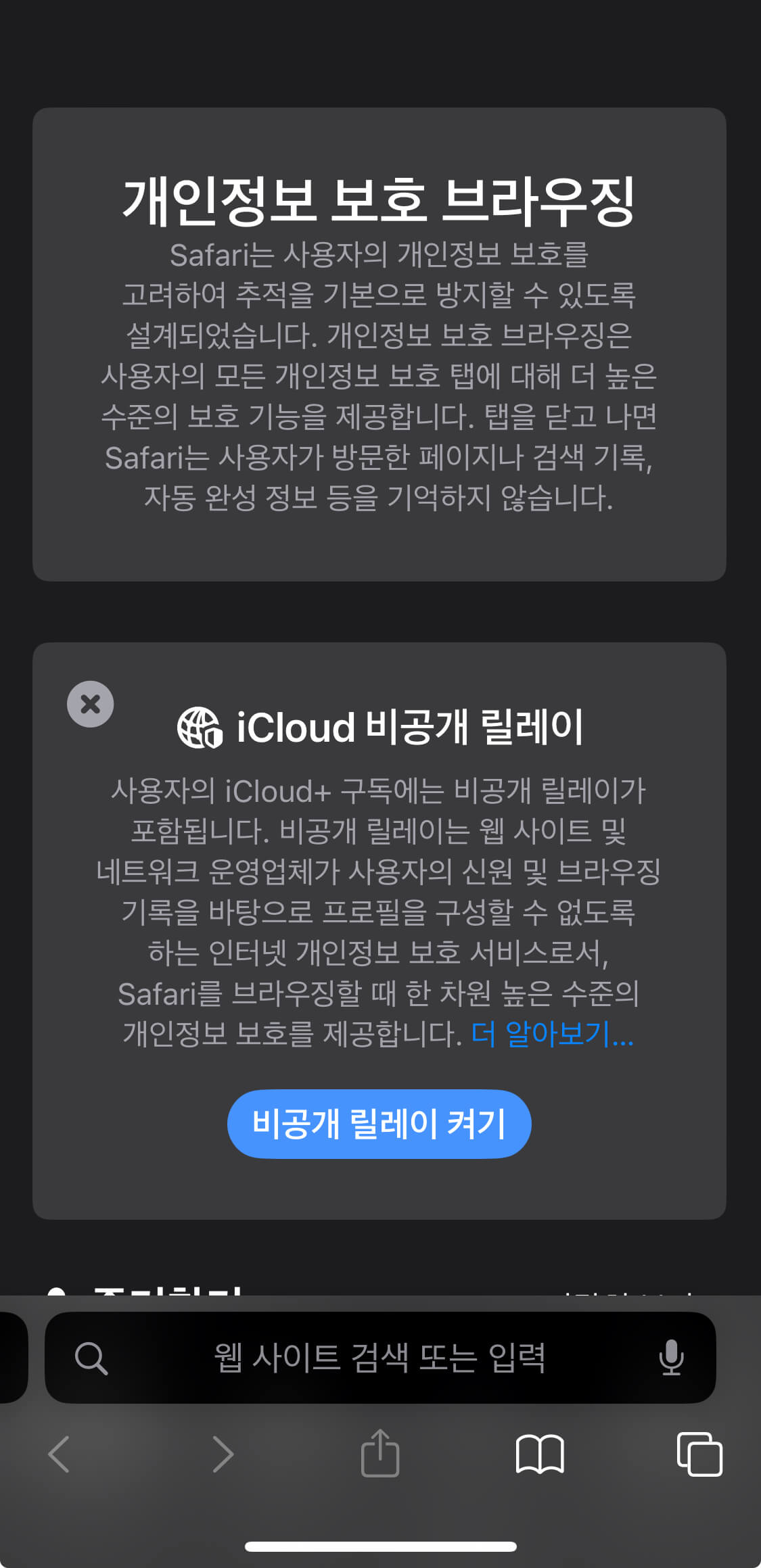 이러한 아이폰 개인정보 보호 브라우징 모드를 모르는 분들의 경우 간혹 놀라서 뭐가 잘못되었나 오해도 한다고 하더라고요.