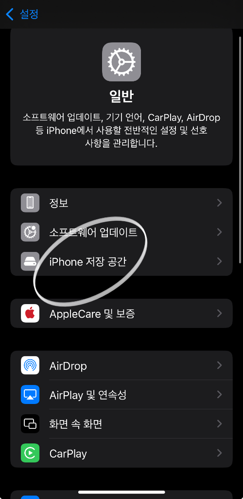 2. '일반'으로 이동해서 'iPhone 저장 공간'으로 가줍니다.