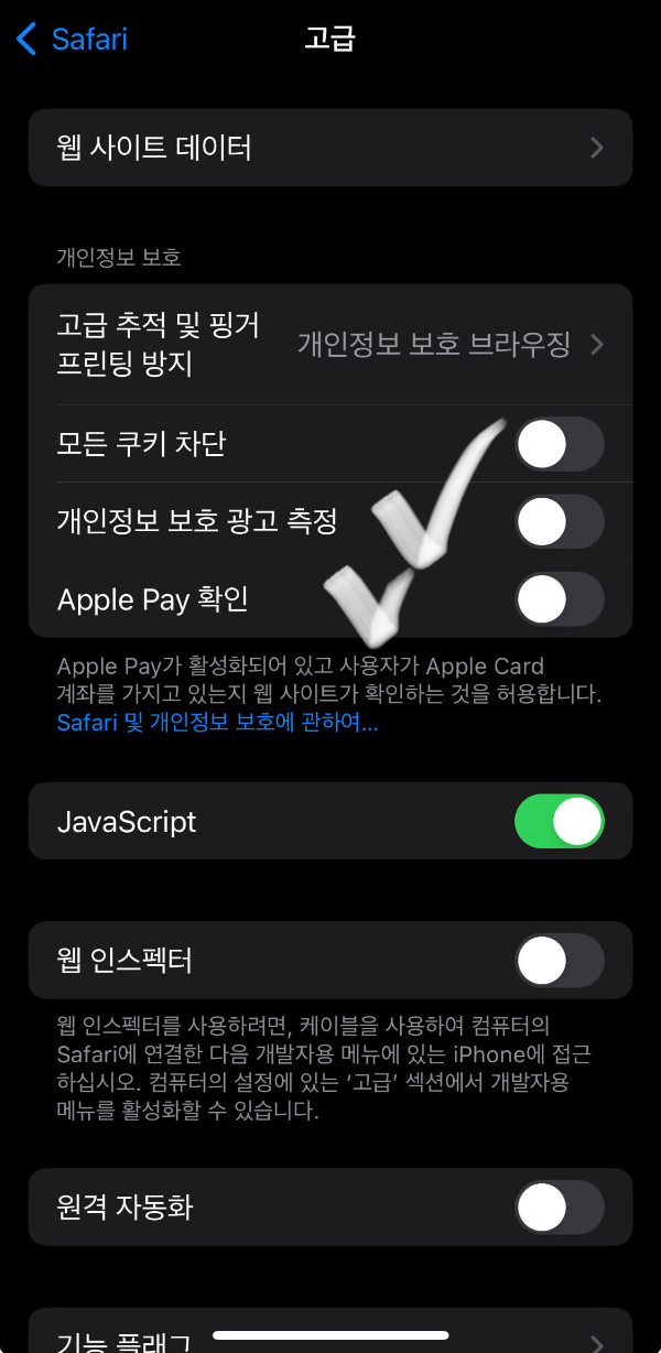 개인정보 보호 광고 측정 / Apple Pay 확인