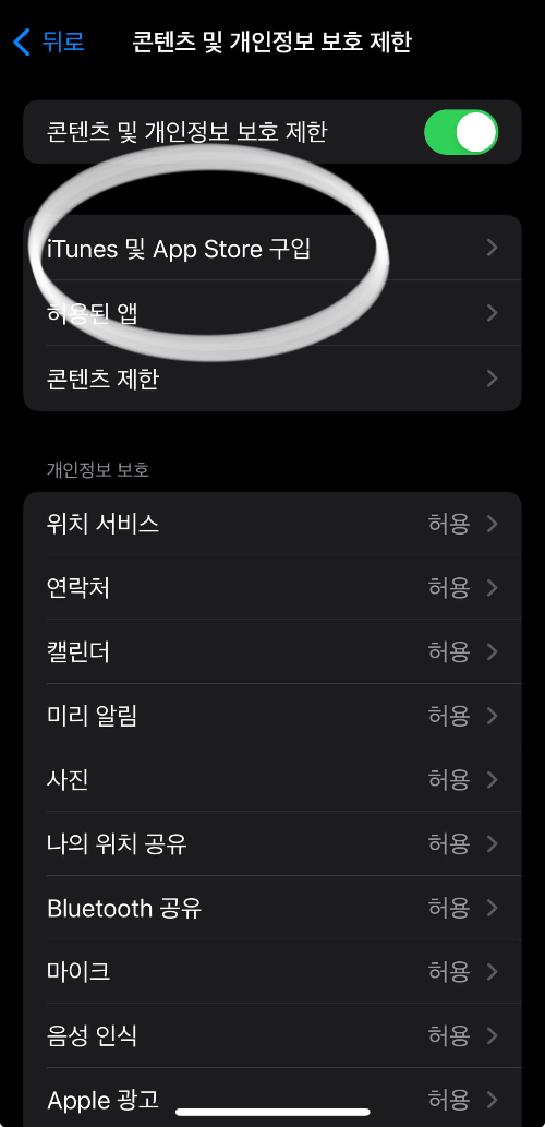 - "콘텐츠 및 개인정보 보호 제한" 초록색 체크 유무 확인