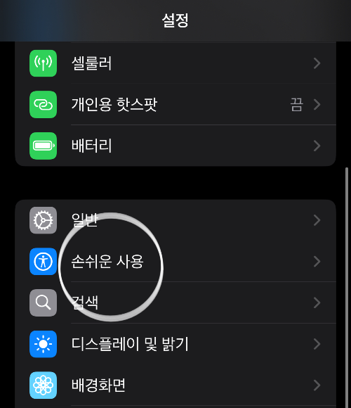 - 설정 메뉴를 아래로 스크롤하여 '손쉬운 사용'을 찾습니다.