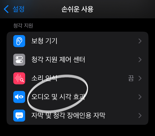 - 손쉬운 사용 메뉴에서 '오디오/시각 효과'를 탭합니다.