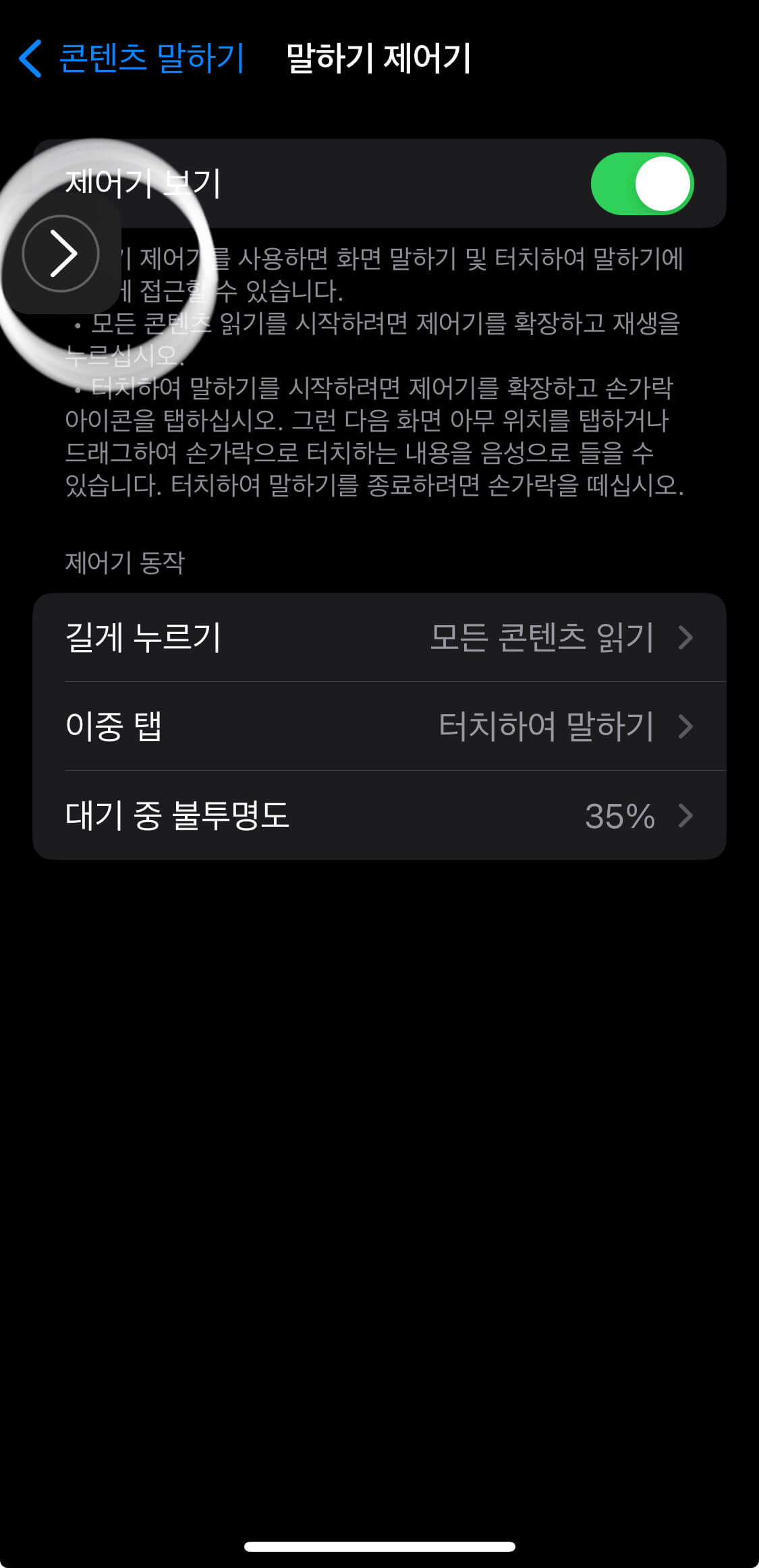 화면말하기를 체크 -> 말하기 제어기 설정을 할 수 있습니다.