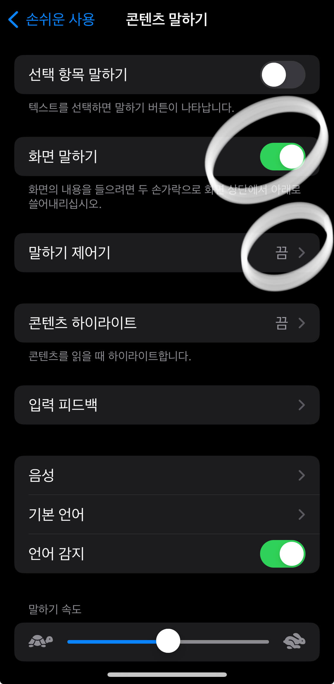 - "화면 말하기"를 체크해 주세요.