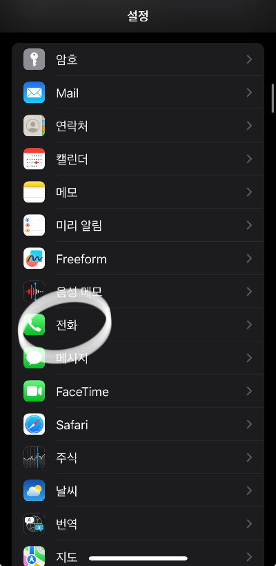 - "설정"앱에서 초록색 아이콘에 "전화"앱으로 이동