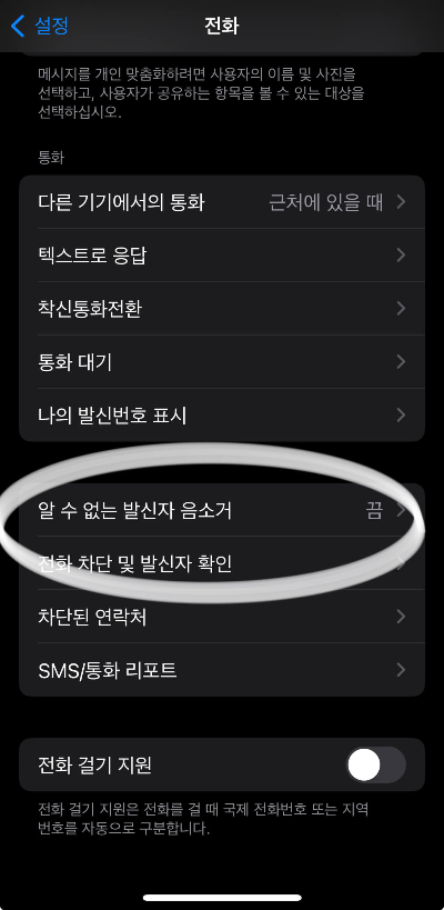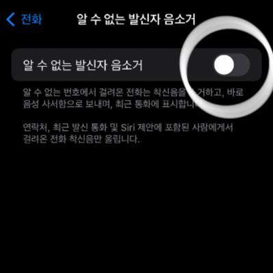 "전화"앱에서 아래로 스크롤 내려주고 "알 수 없는 발신자 음소거" 선택