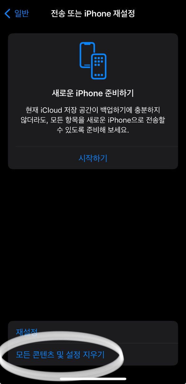 - 화면 아래 - '모든 콘텐츠 및 설정 지우기'