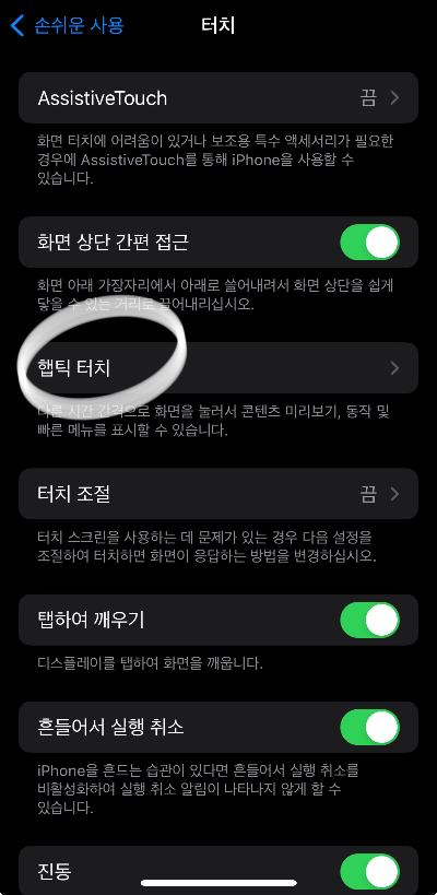 - 터치 설정 화면을 보시면 '햅틱 터치'라는 부분이 있습니다.