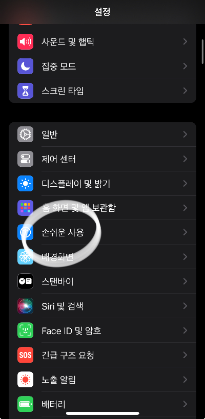 - 다음 설정 화면 중간정도에 위치한 '손쉬운 사용'을 선택해줍니다.