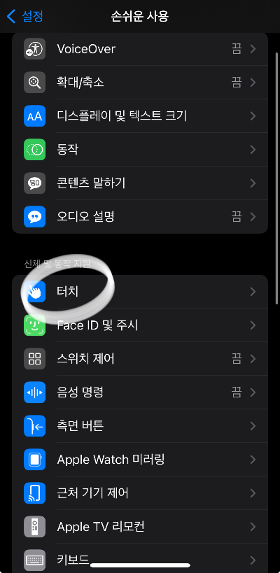 아이폰 설정 -> 손쉬운 사용 -> 동작 및 신체활동에서 '터치' 선택
