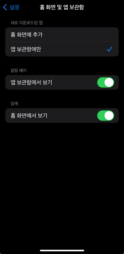 아이폰 설정 - 홈 화면 및 앱 보관함 - (새로 다운로드된 앱) 홈 화면에 추거 / 앱 보관함에만 중 선택