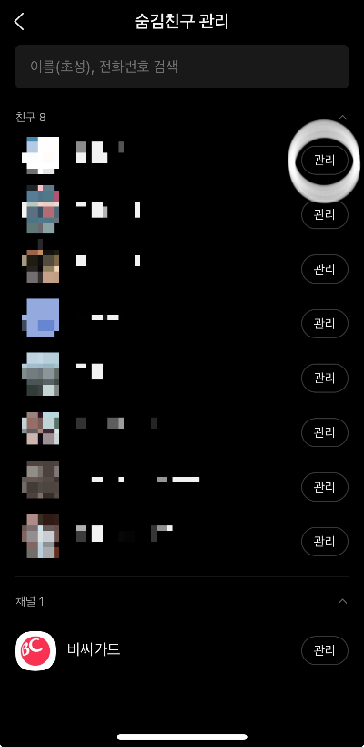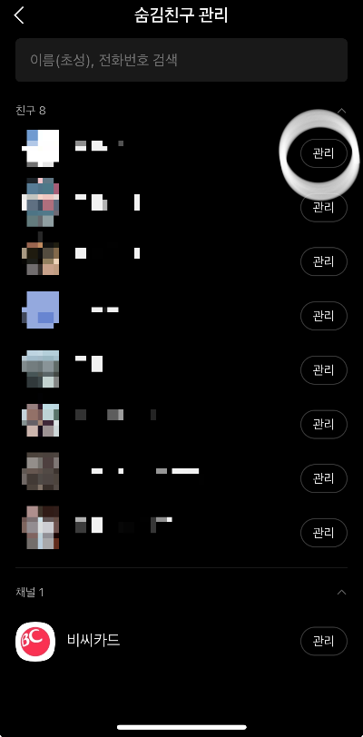 1. 숨김친구 관리 화면에서 우측에 "관리"를 선택