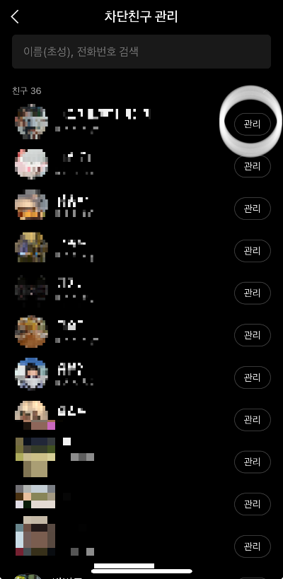 2."차단친구 관리"화면에서 우측 "관리"를 선택