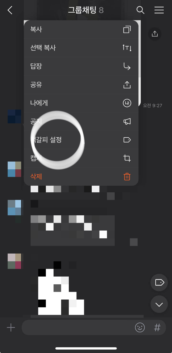 채팅창 내용에서 원하거나 필요한 내용에 채팅을 꾹 눌러주시면 설정 메뉴가 나옵니다.