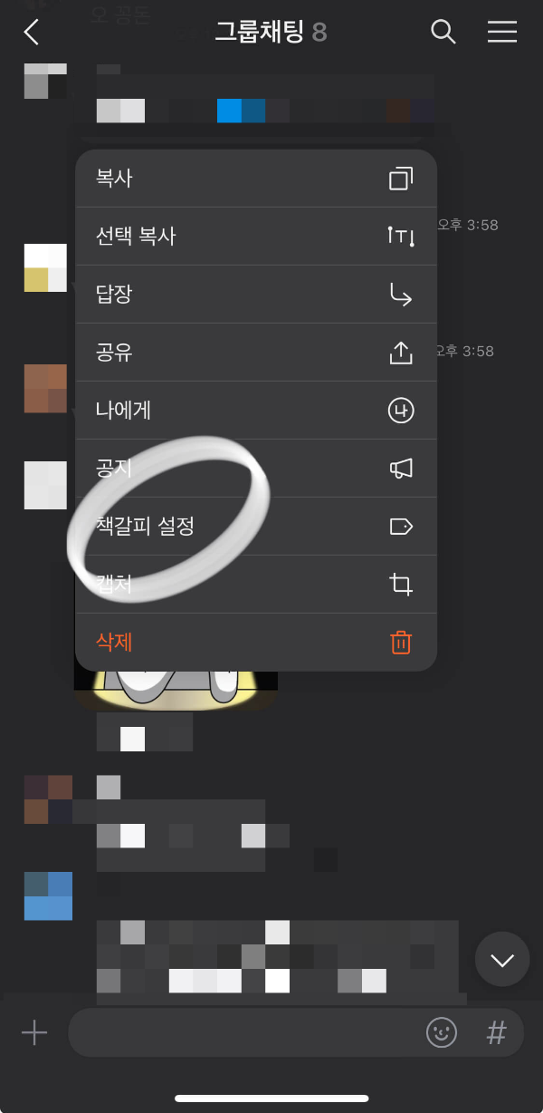 - 채팅창 내용에서 중요한 채팅을 꾹 눌러주세요.