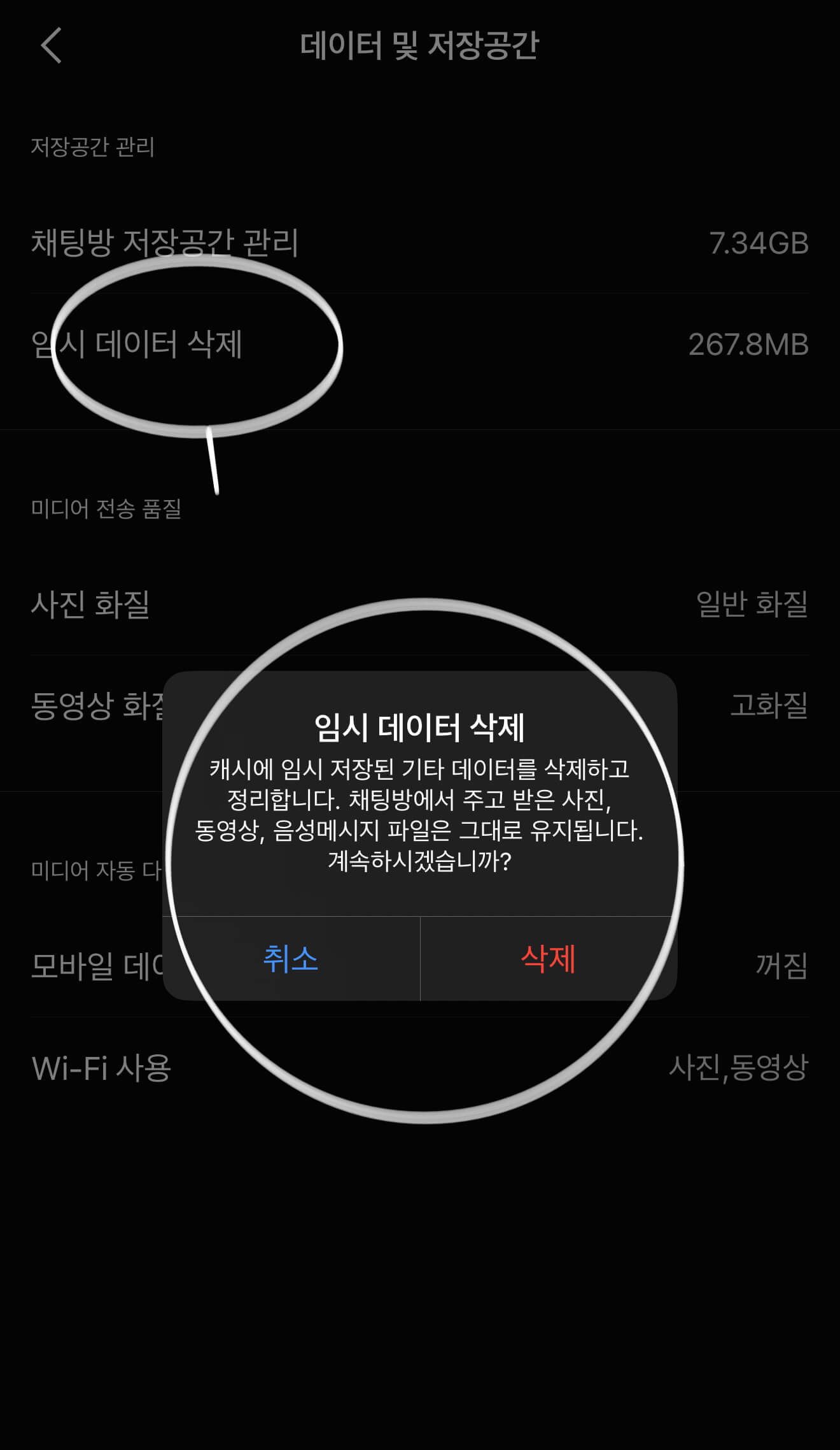 - 캐시 데이터 삭제는 채팅방의 사진, 동영상, 음성메시지에 영향을 주지 않습니다.