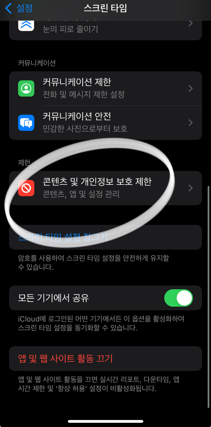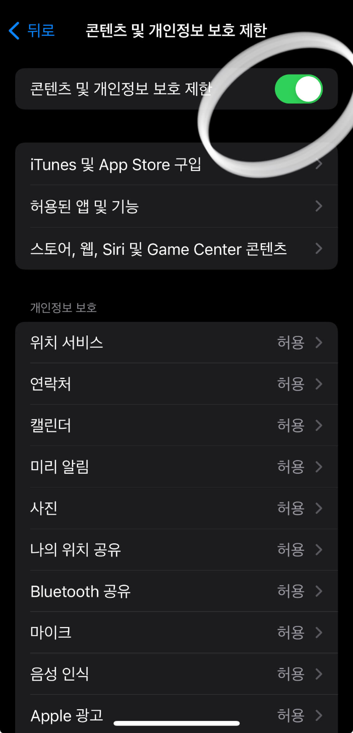 스크린타임 - 콘텐츠 및 개인정보 보호 제한 설정 활성화
