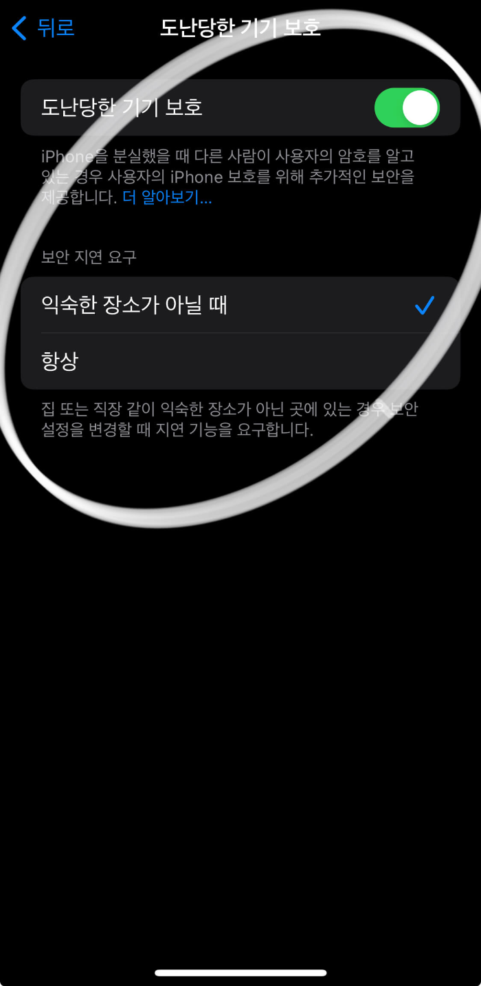아이폰 도난당한 기기 보호 기능은 사용자의 아이폰 보호를 위해 보안 지연 요구를 설정할 수 있습니다.