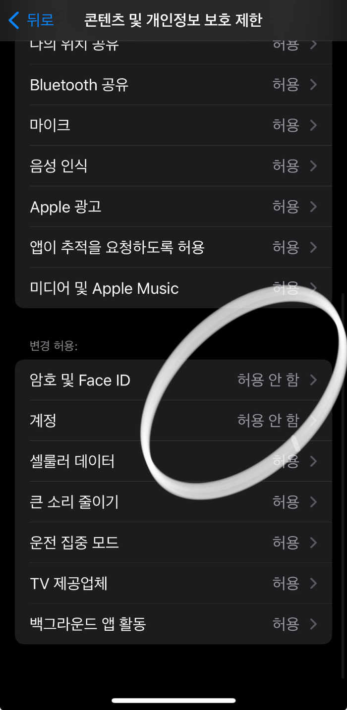 암호 및 페이스 아이디 그리고 계정에 대해서 변경 허용을 '허용 안 함'으로 설정하면