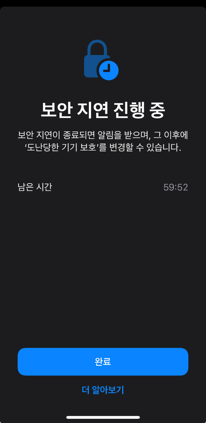 이 기능은 아이폰을 도난당했을 때 상대방이 암호를 알고 있더라도 1시간 정도의 시간을 벌 수 있는 기능입니다.